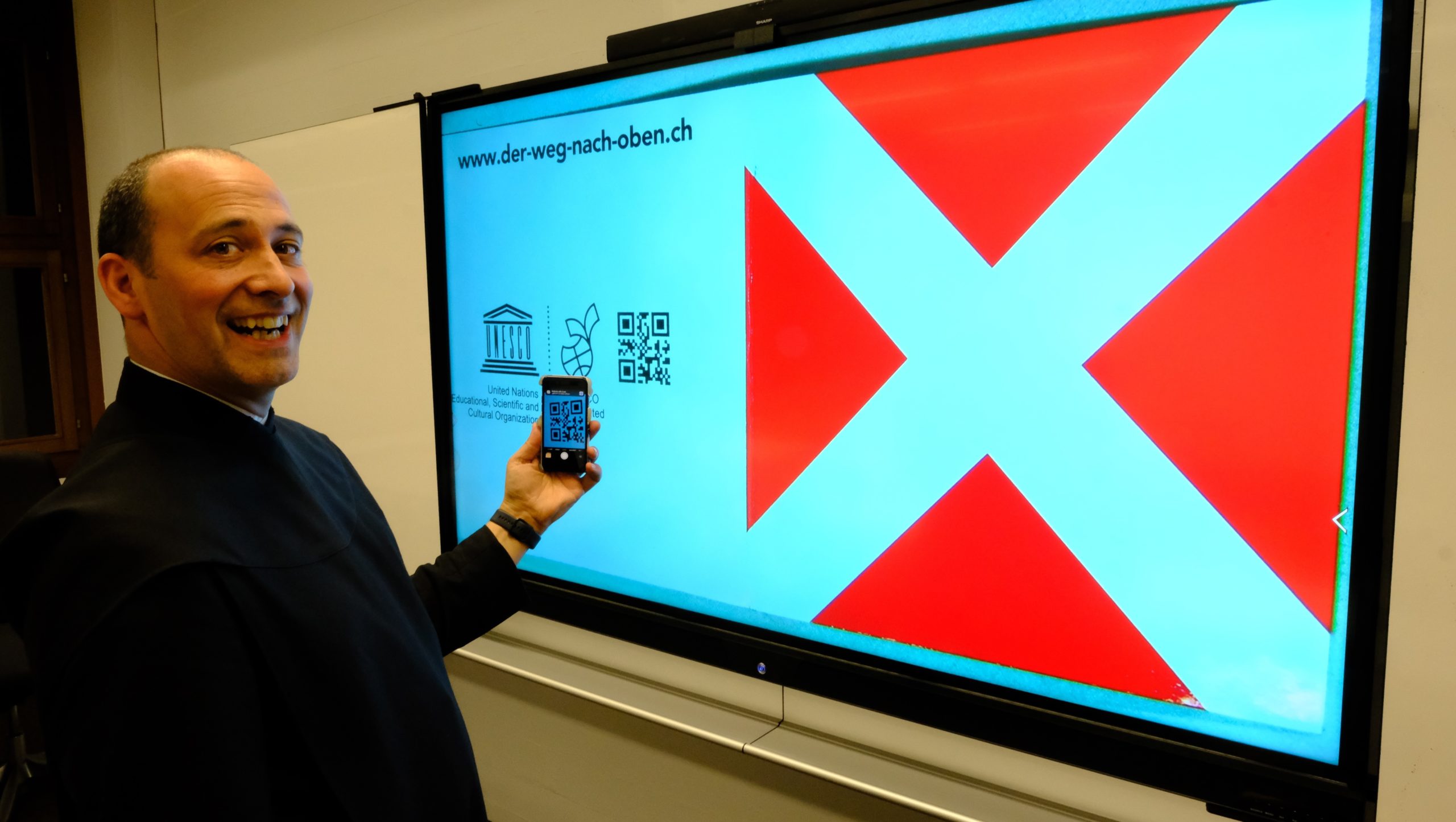 Picture: A monk standing in front of a digital whiteboard, scanning the QR code with its smartphone. The smartwatch on his wrist further underscores the integration of digital tools into monastic daily life. Source: first author’s fieldwork.